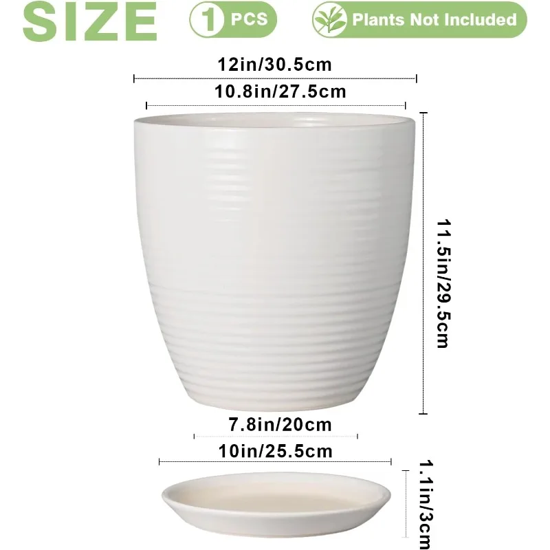 Package Include: 12 inch ceramic plant pot (12” D x12” H)×1, removable ceramic tray×1, 3.4cm drainage net×1, plants not included