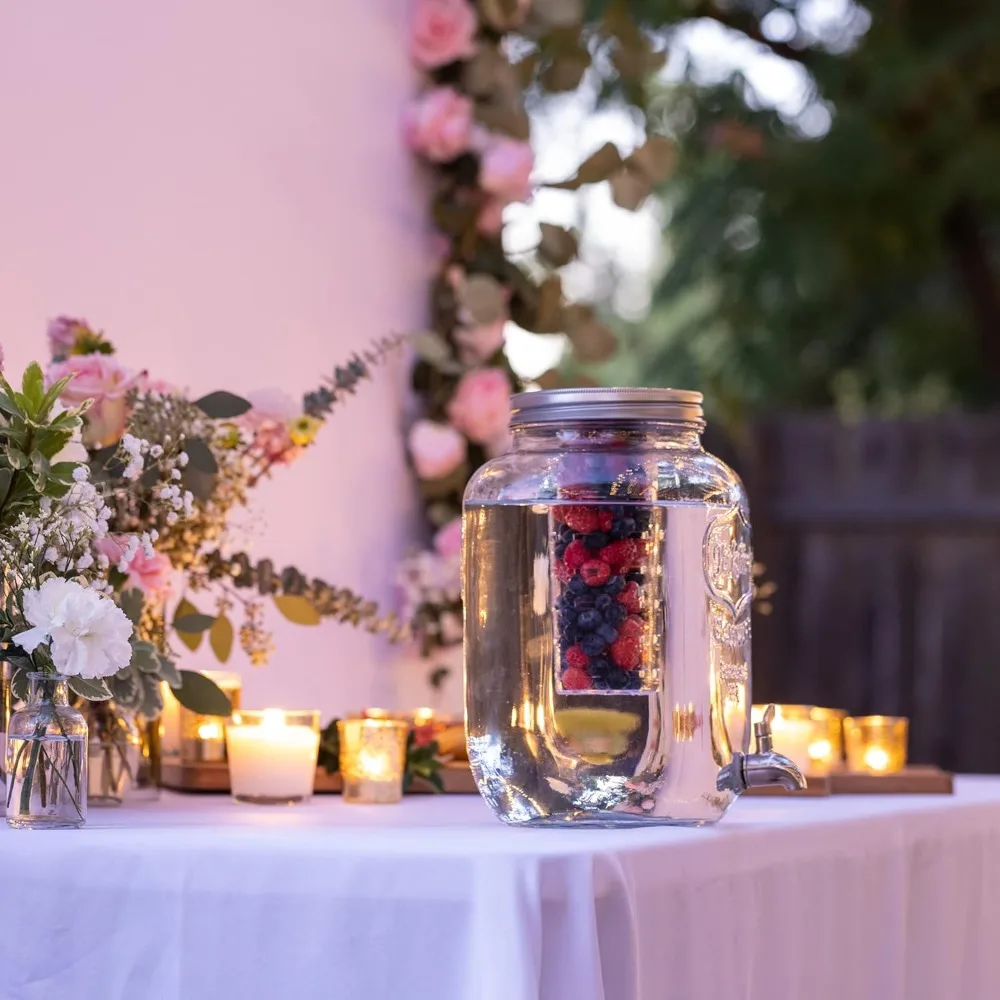 BEAUTIFUL & DURABLE: This mason jar is made from high-grade, thick glass, providing durability and an elegant appearance that can enhance any party or living space. The jar features a wide-mouth stainless steel lid, which ensures an airtight seal and freshness, while the stainless steel spigot is rust-resistant, lead-free, and leak-proof. The jar also comes with a fruit infuser, making it a convenient choice for serving flavored beverages.
