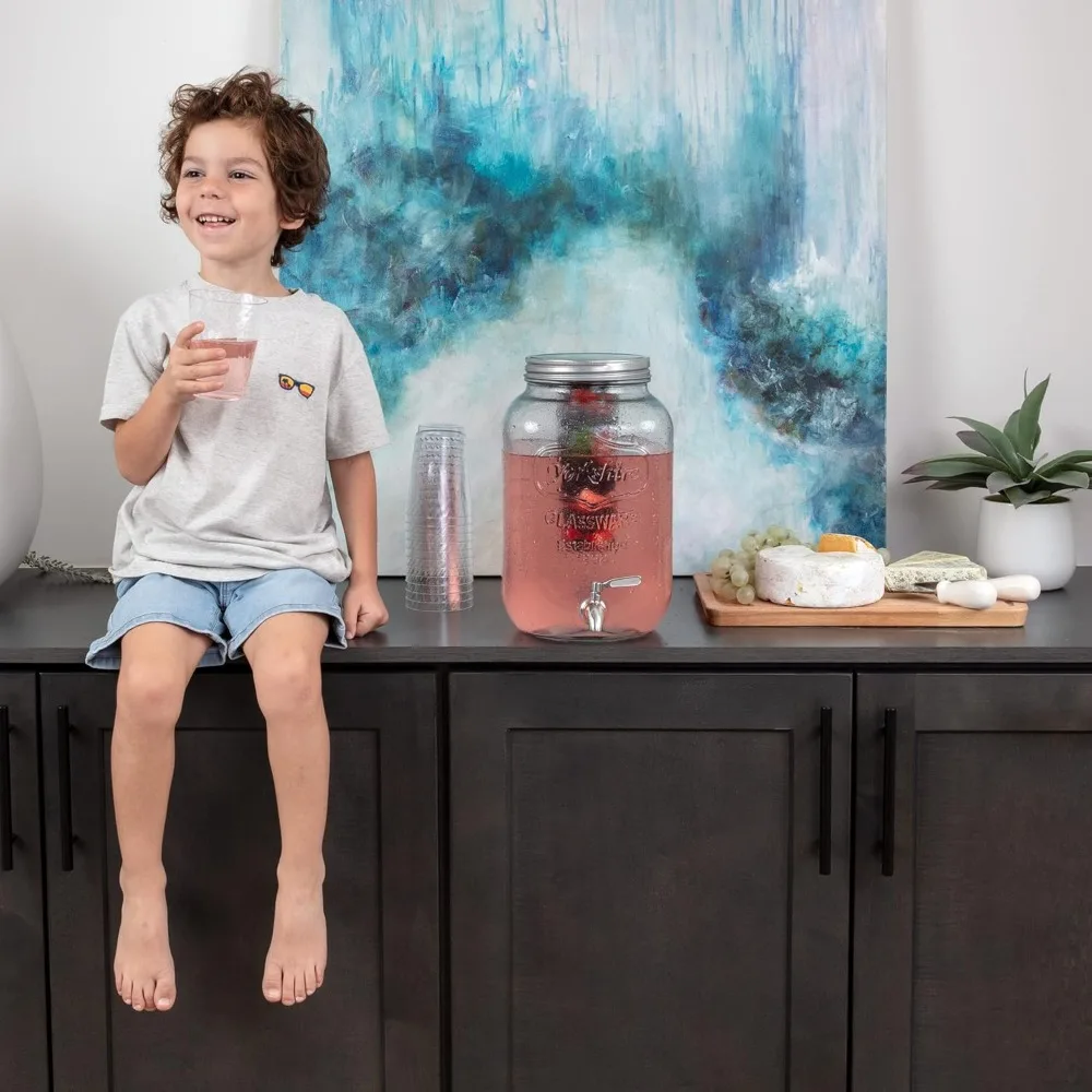 ALL-PURPOSE GLASS MASON JAR DISPENSER: The Glass Mason Jar Beverage Dispenser is a versatile liquid dispenser that can be used to serve a variety of beverages. Made of high-quality glass, it has an artistically pleasing shape that can complement any space. It can be used to serve refreshing juices, dispense or Halloween drinks, and even works well as a laundry detergent dispenser.