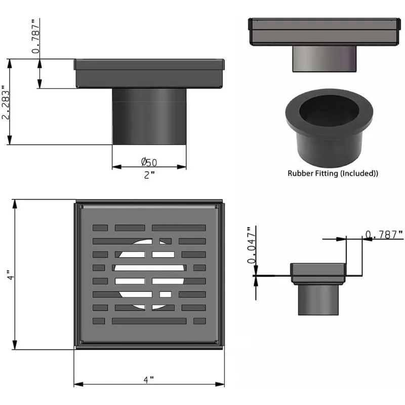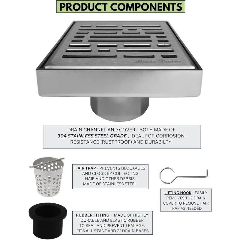 Includes: Square bathroom shower drain grate and body, stainless steel shower drain hair catcher, lifting hook and rubber fitting.