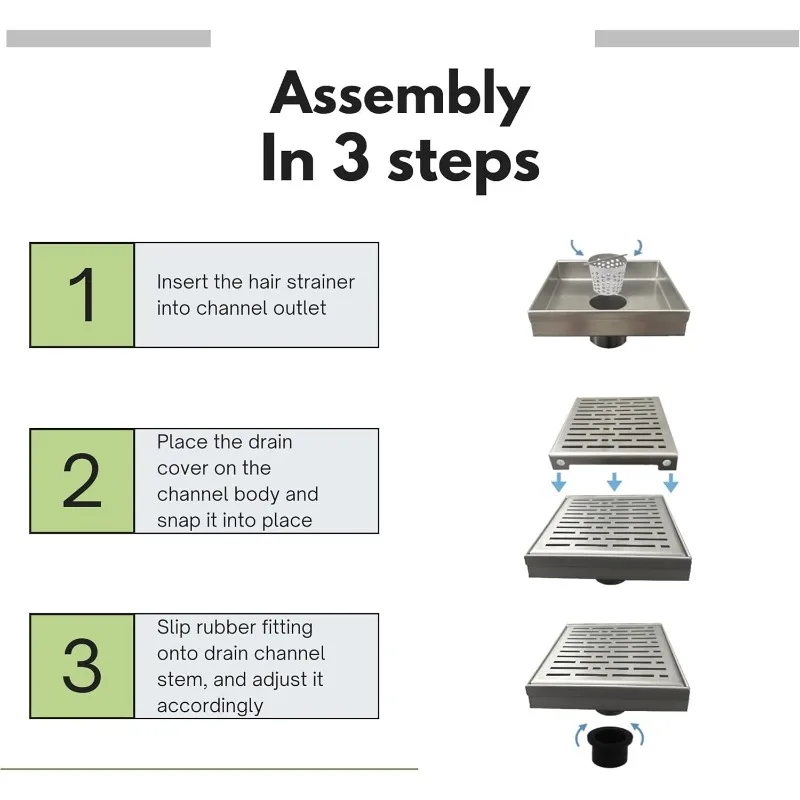 High Quality Materials: square shower drains are made of 16 gauge SS304 stainless steel body and floor drain cover. Brushed steel finish protects the square shower drain from corrosion & rust